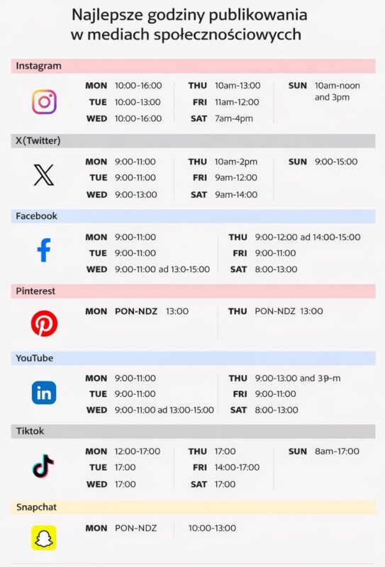 Każda platforma ma inne zachowania użytkowników. To, co działa na Instagramie, niekoniecznie sprawdzi się na Twitterze. Dlatego warto dopasować zarówno godziny publikacji, jak i format treści do konkretnej platformy.